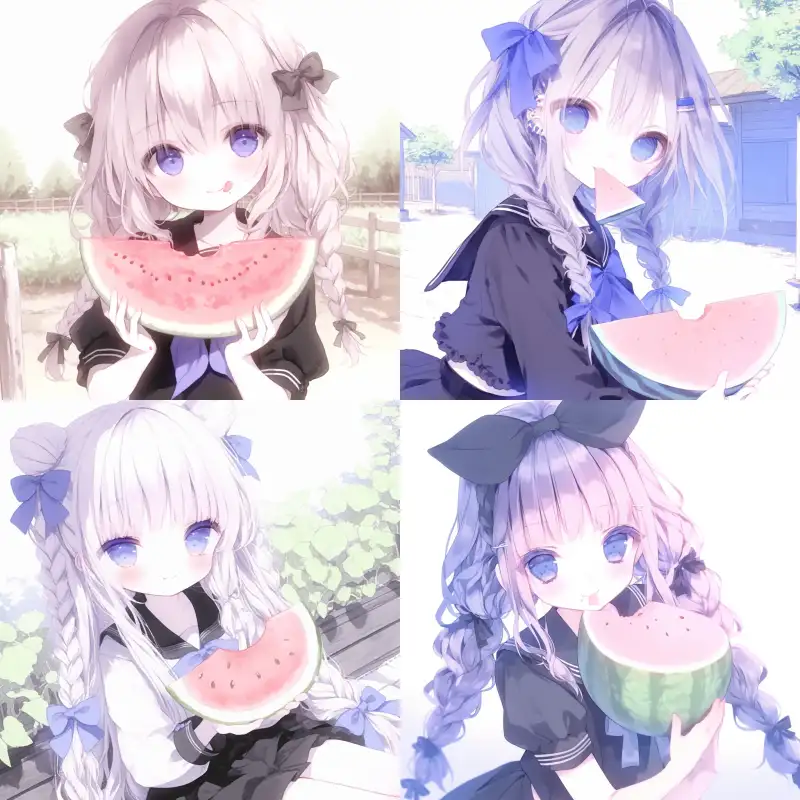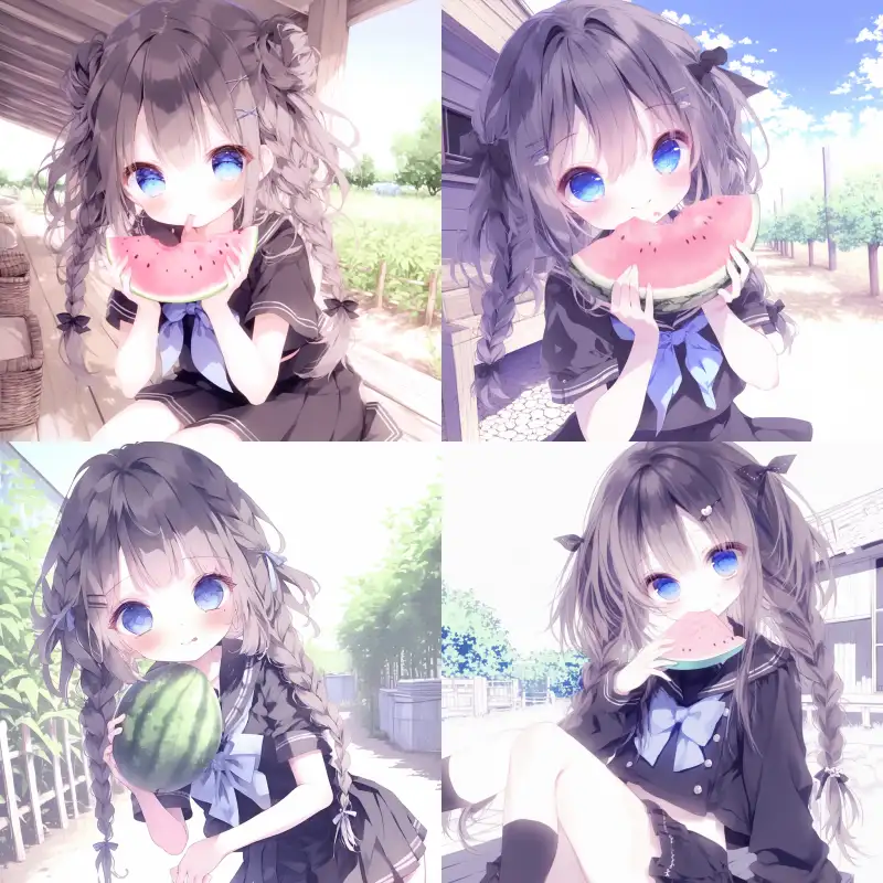 Midjourney Bot 更新时间:2024-11-24 00:08The girl with watermelon in her arms, blue double Fried Dough Twists braids, blue eyes, chewing in her mouth, hollow cloud hairpin, no hairpin, black sailor suit, blue skirt, blue bow tie, half a watermelon in one hand, face rubbing in the other, the background is a farmyard, and the foreground is bright --sref