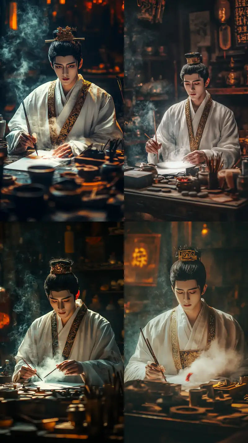 Midjourney Bot 更新时间:2024-11-24 00:08Black Myth: Wukong style, the breath of demons permeates, at night, in an ancient Chinese shop, a handsome ancient Chinese man uses a stick to draw a wisp of red mist from a rooster, wearing a golden hairband, with brushes, ink, paper, and inkstones placed on the counter, full body shot, reaction shot, wind, vibrant colors, lively, high quality, ultra-high, dynamic, (8k, original photo), clear focus, (insane details), high-detail photo, photographic realism, surrealism, continuous angles, perfect composition, natural geometric shapes, the camera looks into the past, sparkling eyes, drowsy face, simulated film photo, thin mist and dust Section 6.1 Section 9:16 --cref