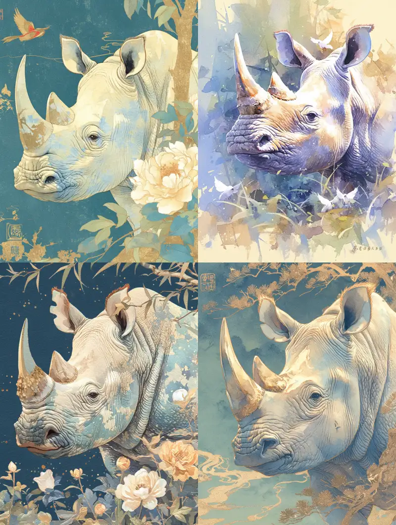 Midjourney Bot 更新时间:2024-11-23 00:00Song embroidery, watercolor angry rhinoceros, glass style, ultra-high quality 32k, delicate texture, exquisite craftsmanship, Song Huizong style, Zhang Daqian style, rich details, artistic sense, traditional craftsmanship, cultural inheritance, blue-green and gold, advanced color scheme, high resolution, traditional aesthetics --niji 6 --ar 3:4 --no person --s 946