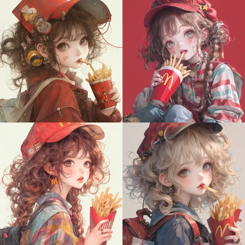 Midjourney Bot 更新时间:2024-11-22 00:05Harajuku style, early Japanese anime girl holding fries wearing a red square hat vintage style, --niji 6 --ar 1:1 --style raw --s 250 --p 5olw4bk
