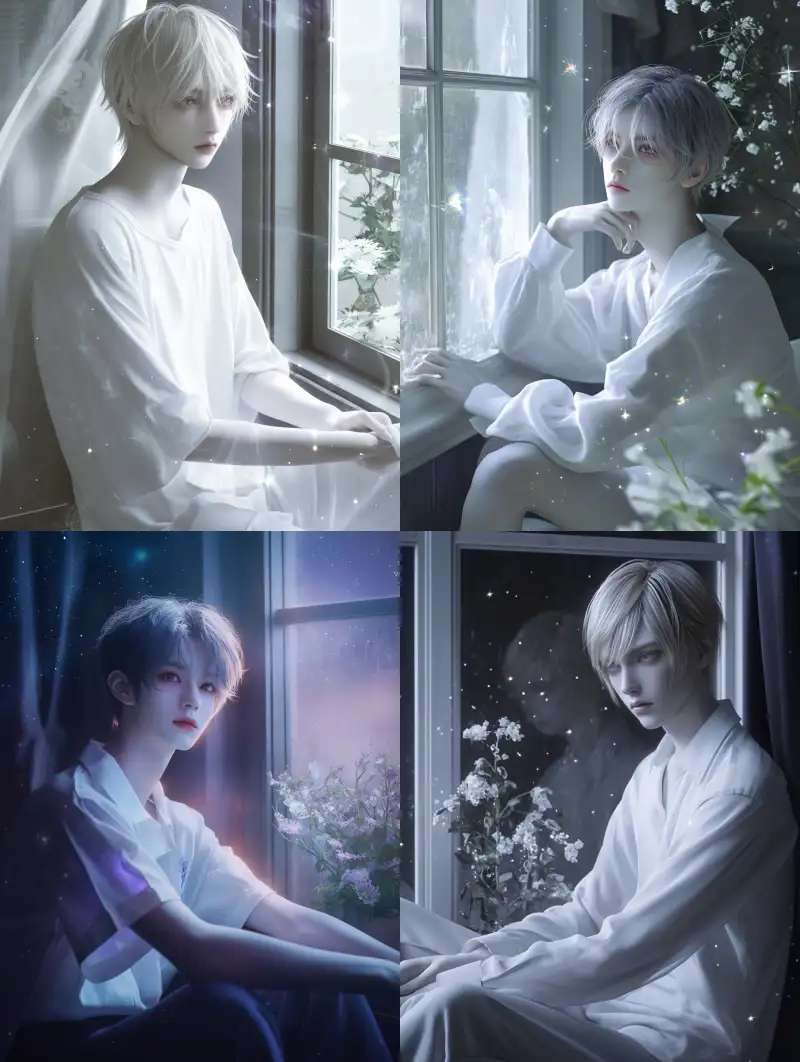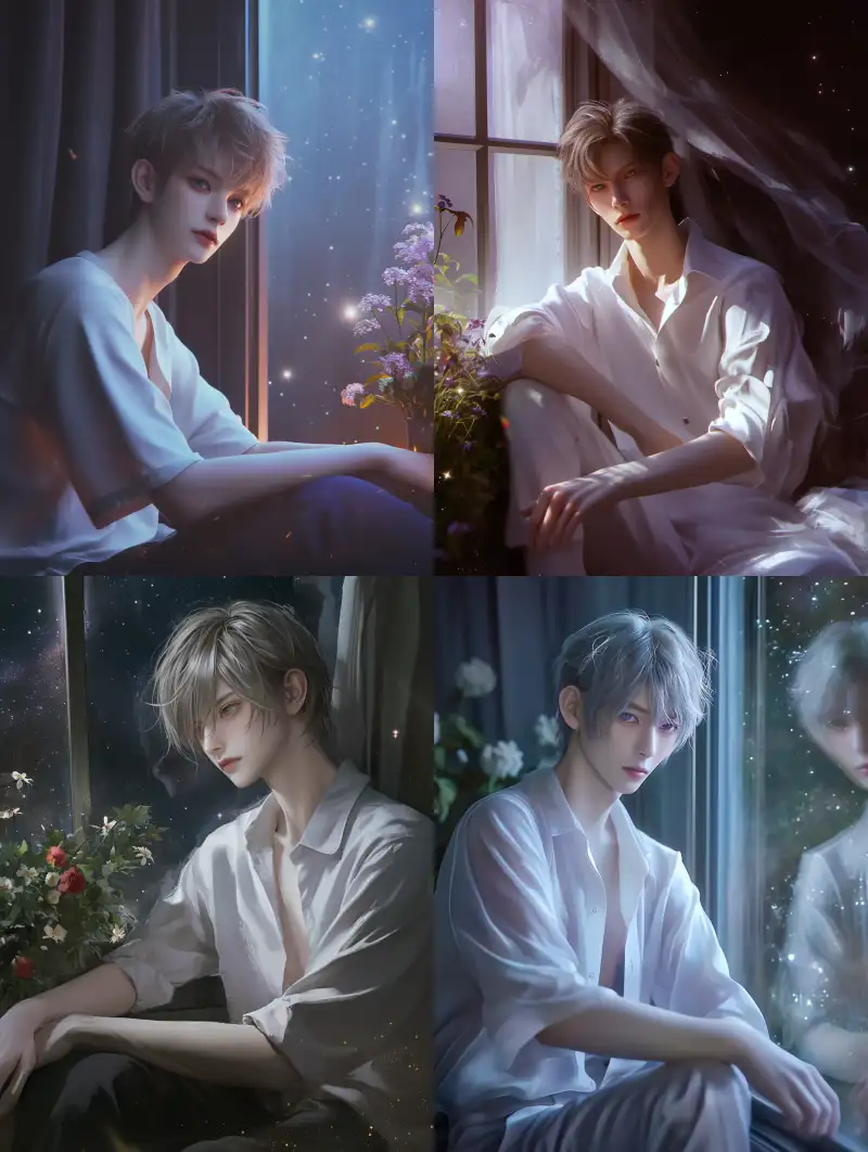 Midjourney Bot 更新时间:2024-11-22 00:07A very handsome young man sits by the window, bright eyes, fair skin, light-colored hair, thick makeup, high-definition face, CG rendering, high-definition detail rendering, highest image quality, high sharpness, low saturation, contrast of light and shadow, a small amount of flowers, twinkling starlight, medium-long shot --niji 6 --ar 3:4 --style raw --no Earrings, wrinkles, beards