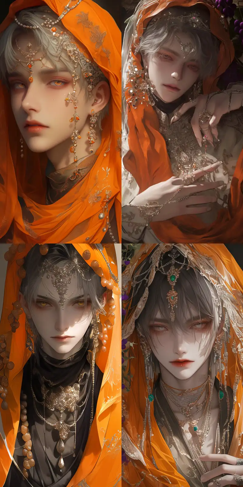 Midjourney Bot 更新时间:2024-11-21 00:09Exotic boy, realistic, orange veil, silver dark pattern, crystal accessories, gray short hair, grape trellis, movie grade lighting, bright eyes, exquisite makeup, exquisite accessories, exotic style, 8K resolution, realism, ultimate details, ultra high definition, soft, highest quality --niji 6 --ar 1:2 --style raw