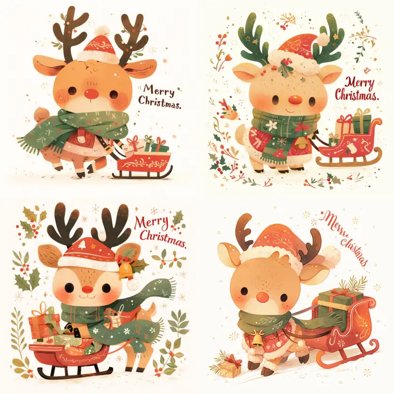 Midjourney Bot 更新时间:2024-11-21 00:09A Christmas sticker design featuring a cute little reindeer, pulling a sleigh, wearing a green scarf and a red Christmas hat. The sticker has handwritten floral letters saying "Merry Christmas." The background is clean pure white, 8K ultra HD. --niji 6 --ar 1:1 --no Written words, symbols, low quality --s 466
