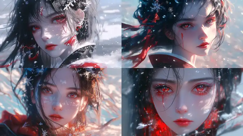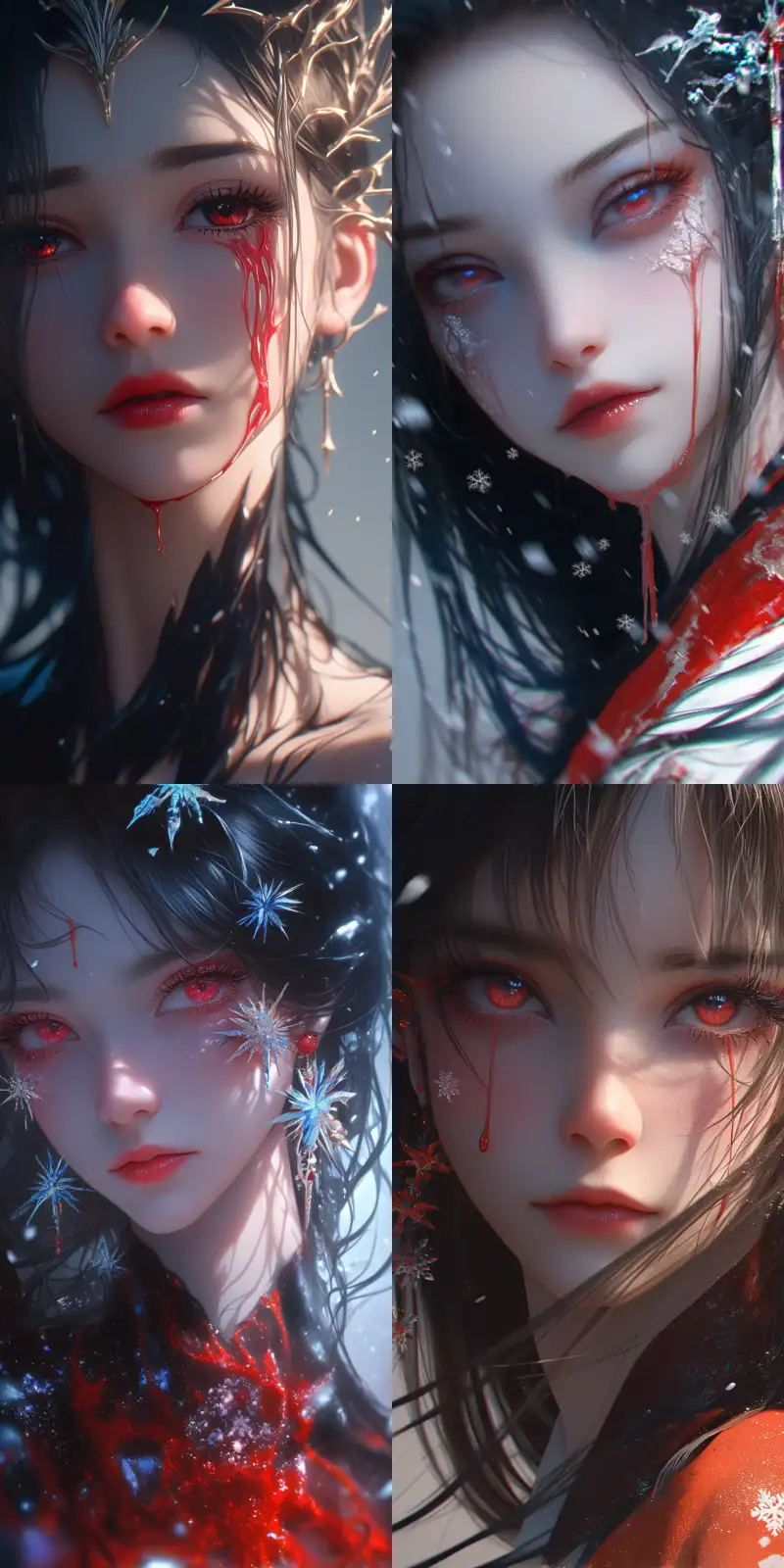Midjourney Bot 更新时间:2024-11-21 00:09Realistic, girlish, with red liquid flowing down her cheeks, black hair, red eyes, snowflakes, upper body, crazy style, sickly and delicate, movie grade lighting, bright eyes, exquisite makeup, exquisite accessories, 8K resolution, realism, ultimate details, ultra high definition, softness, highest quality --niji 6 --ar 16:9