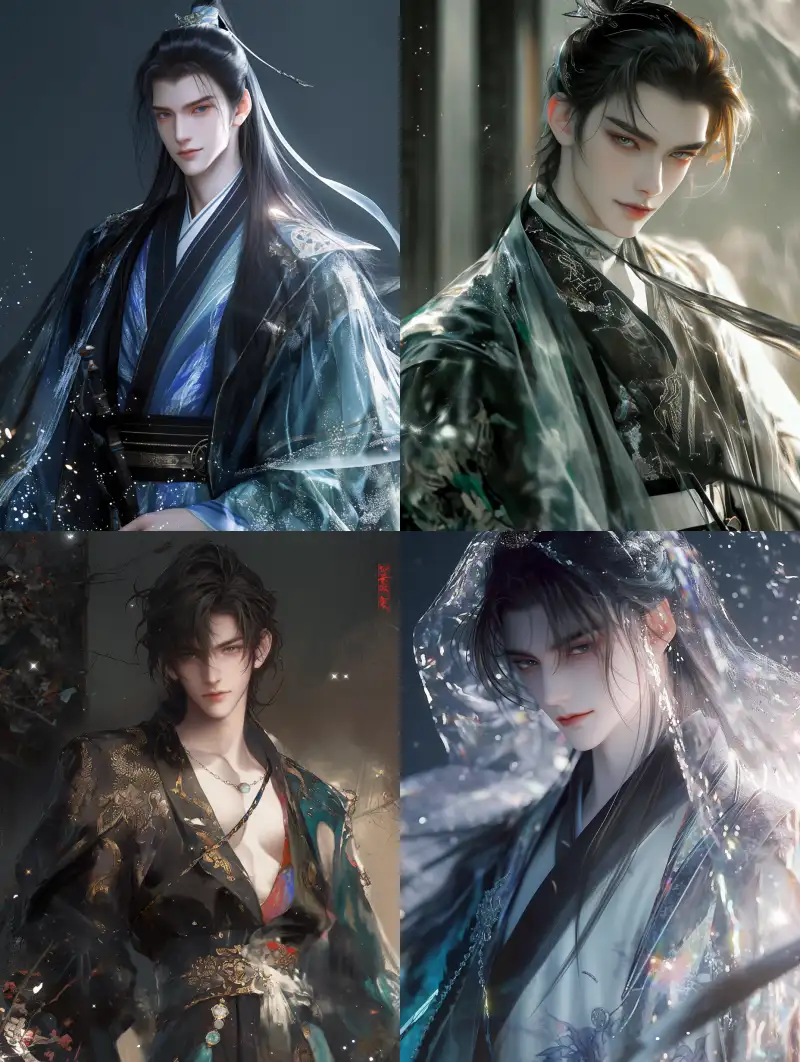 Midjourney Bot 更新时间:2024-11-22 00:00A young and handsome nobleman, with a thick and smooth face, cold white skin tone, confident smile, bright and clear face, thick and fluffy hair, thick and colorful gorgeous clothing, semi transparent gauze, brilliant lighting effects to form a layered spatial sense, Chinese ink painting, ultra high definition rendering of overall character details CG rendering, 8K, highest image quality, light color tone, half body portrait, low saturation, high sharpness, strong contrast between light and dark, thick and fluffy hair, thick and translucent, sparkling in the middle and far view, --niji 6 --ar 3:4 --style raw --no Earrings, wrinkles, beards