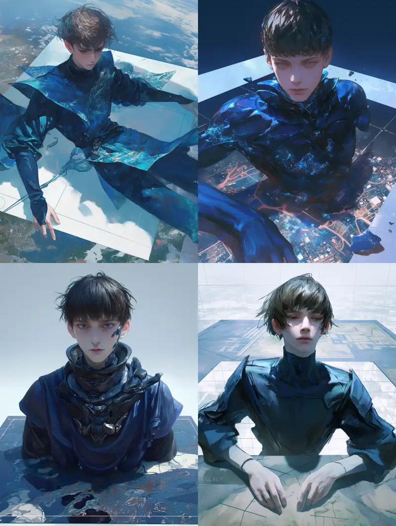 Midjourney Bot 更新时间:2024-11-22 00:00A short-haired man, dressed in a blue-black outfit, his upper body on a square map, and his lower body in an empty void. He has a blank expression, a fantastical space, a handsome man, irregular bangs, perfect details, ultra-high quality, ultra-high resolution, high precision, a masterpiece, 32k. --niji 6 --ar 3:4 --no B beard