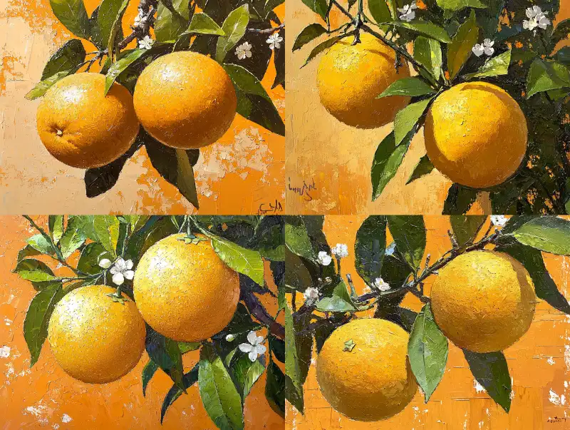 Midjourney Bot 更新时间:2024-11-15 00:02Oil painting, impasto technique, close-up of two oranges on a tree in the air, with one orange in front and the other behind, creating a sense of space in the painting, green leaves, small white flowers, simple brushwork, oil painting, heavy paint, painting style using palette knife technique to create texture. Rich colors, strong contrast between background and subject, sense of space, delicate texture, high saturation, clear details, fresh fruit tones, high resolution, orange background. --v 6.1 --ar 4:3 --no Red Strawberry, Pink Strawberry, Rose Red Strawberry --s 183 --quality 2