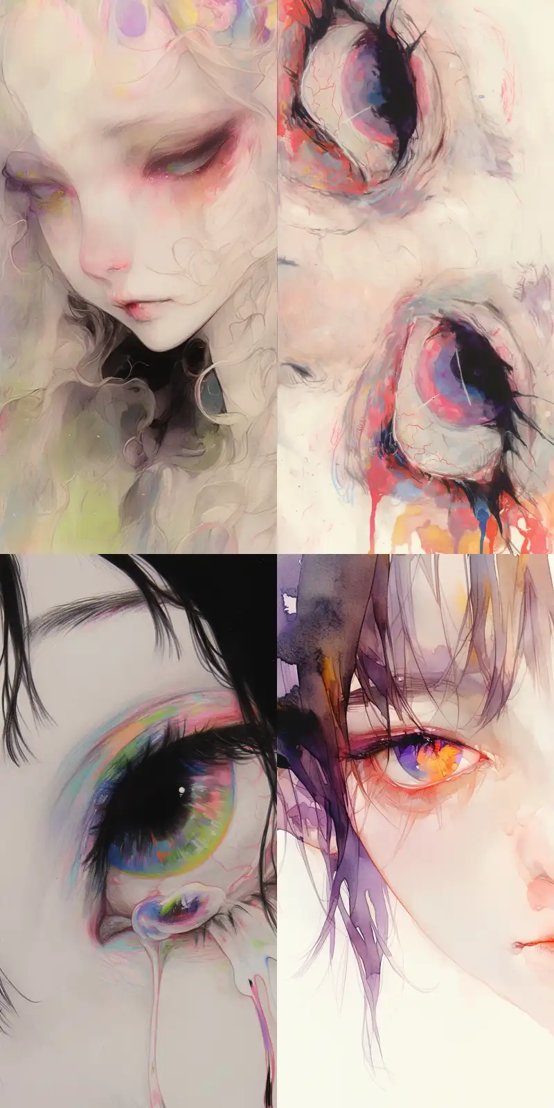 Midjourney Bot 更新时间:2024-11-15 00:03Crayon drawing, watercolor, facial close-up, matte texture, ghost, colorful eyes --niji 6 --ar 1:2 --style raw --s 250