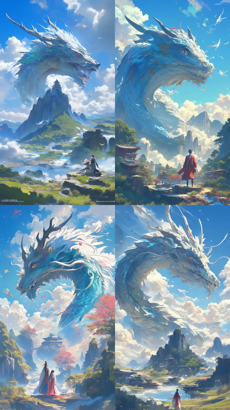 Midjourney Bot 更新时间:2024-11-13 00:08A gigantic Chinese dragon soars in the blue sky, its scales shimmering with golden and green hues, as if burning under the sunlight. Its long whiskers flow like clouds, its body spiraling gracefully, creating a gentle breeze. In the distance stands a towering mountain range, its peak surrounded by white celestial mist, where a few cloaked practitioners can be faintly seen at the edge of the cliff, holding magical artifacts and gazing up at the dragon in the sky. The babbling brook flowing through the mountains sparkles with silver light under the sun, surrounded by lush bamboo groves and blooming peach blossoms, with a delicate fragrance of flowers and spiritual energy permeating the air, creating a fantastical world of immortal heroes. This scene feels like a moment from a dream, evoking a sense of the intertwining of ancient legends and mysterious powers. --niji 6 --ar 9:16 --s 400