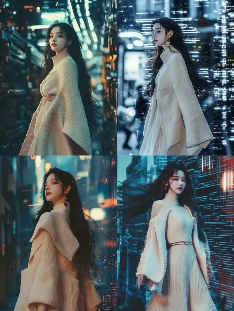 Midjourney Bot 更新时间:2024-11-14 00:00A woman with black flowing long hair, a sense of technology, cyberpunk style, full body image, visual art, artistic photography, realism style, film retro camera shooting, multi angle composition, fashionable, gorgeous and high-end picture, cinematic feel with 32k ultra clear resolution, --cref