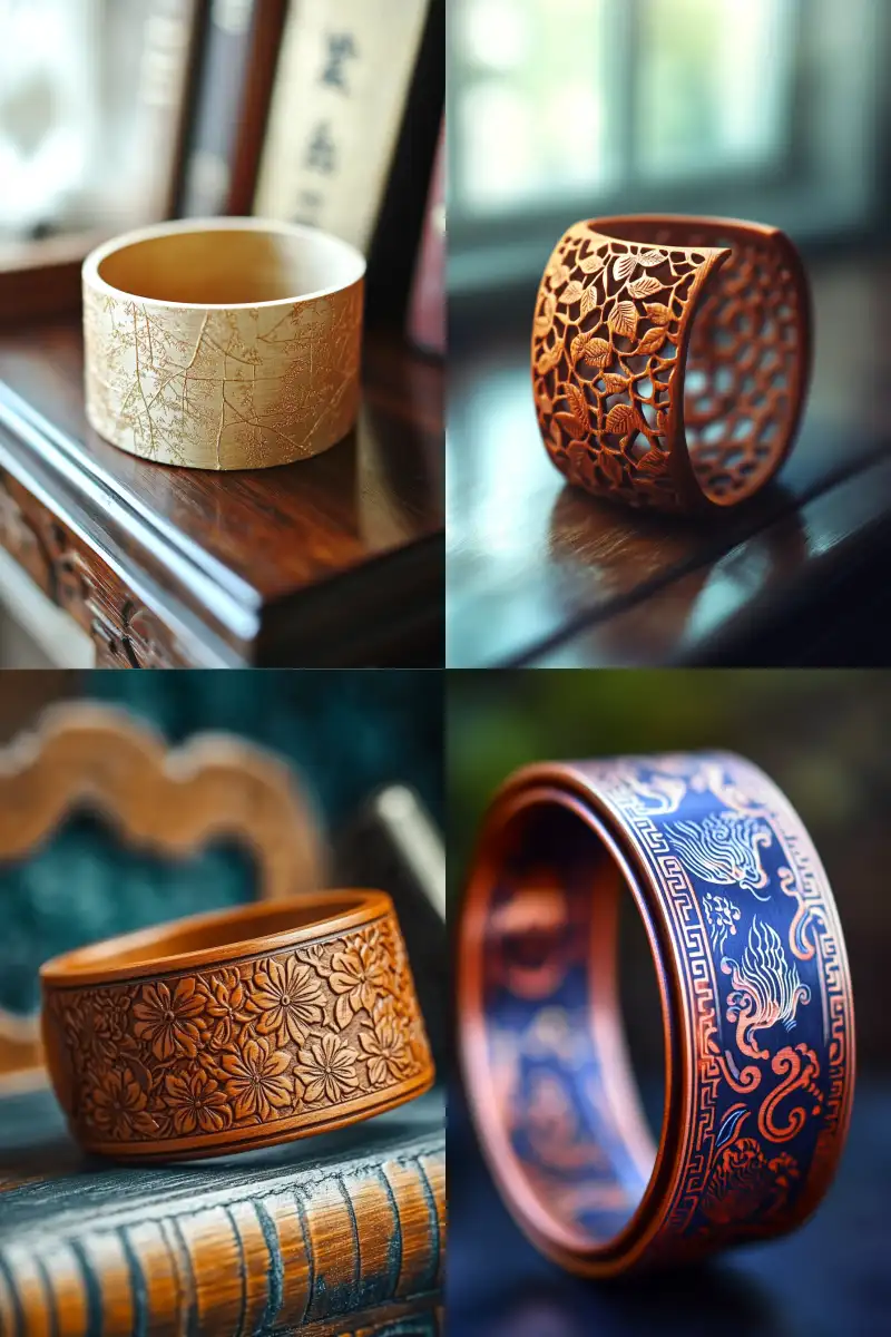 Midjourney Bot 更新时间:2024-11-14 00:02Gold silk nanmu wood bracelet. The surface features exquisite embossed patterns, ins style, with complete and intact designs. Zen aesthetic. Strong artistic shape. --v 6.1 --ar 2:3 --s 1000 --c 42 --weird 50