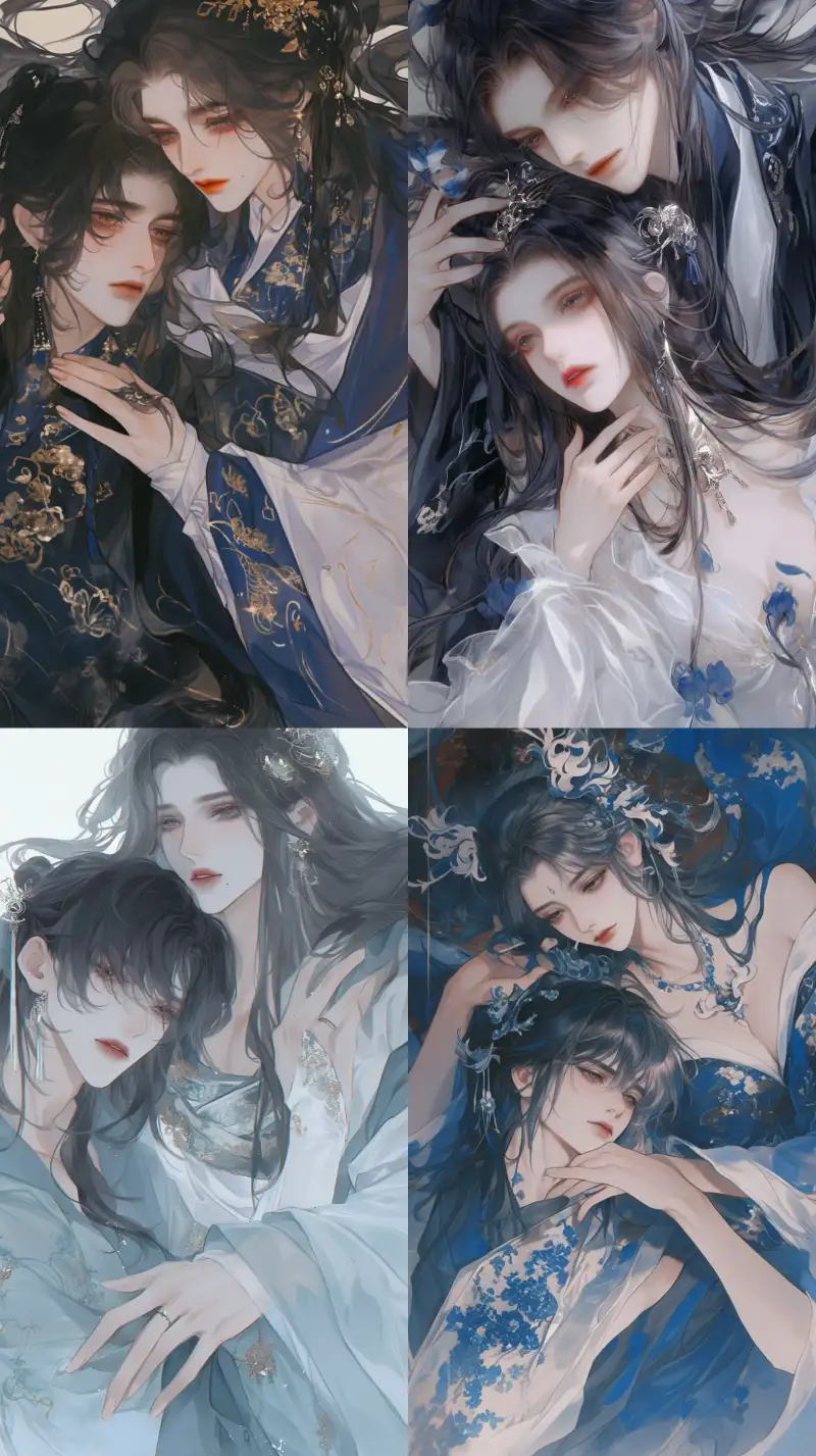 Midjourney Bot 更新时间:2024-11-09 00:19Vision, full body portrait, two beautiful men, A handsome man Hold him on his arms, blue sheer soft smoke Luo Fu Guangjin embroidery gown, amber pupils, half turned bun, long hair, wearing hairpins and kanzashi, blue clothes, very white foundation of makeup, exaggerated eyeliner pen and eye shadow, both ends of the eyes are raised, red lips, collarbone, throat moles, Beijing Opera round collar gown, clean background trend, UHD, Beijing Opera, beautiful and elegant, rich levels of detail, acrylic painting, super painting Solid, bright edge, exquisite, delicate, light spot, fine brushwork, complete portrait. The best light and shadow. Soft lighting. Harmonious color scheme, whole body. Low angle shooting, --niji 6 --ar 9:16 --style raw --s 50 --p jyrxfth