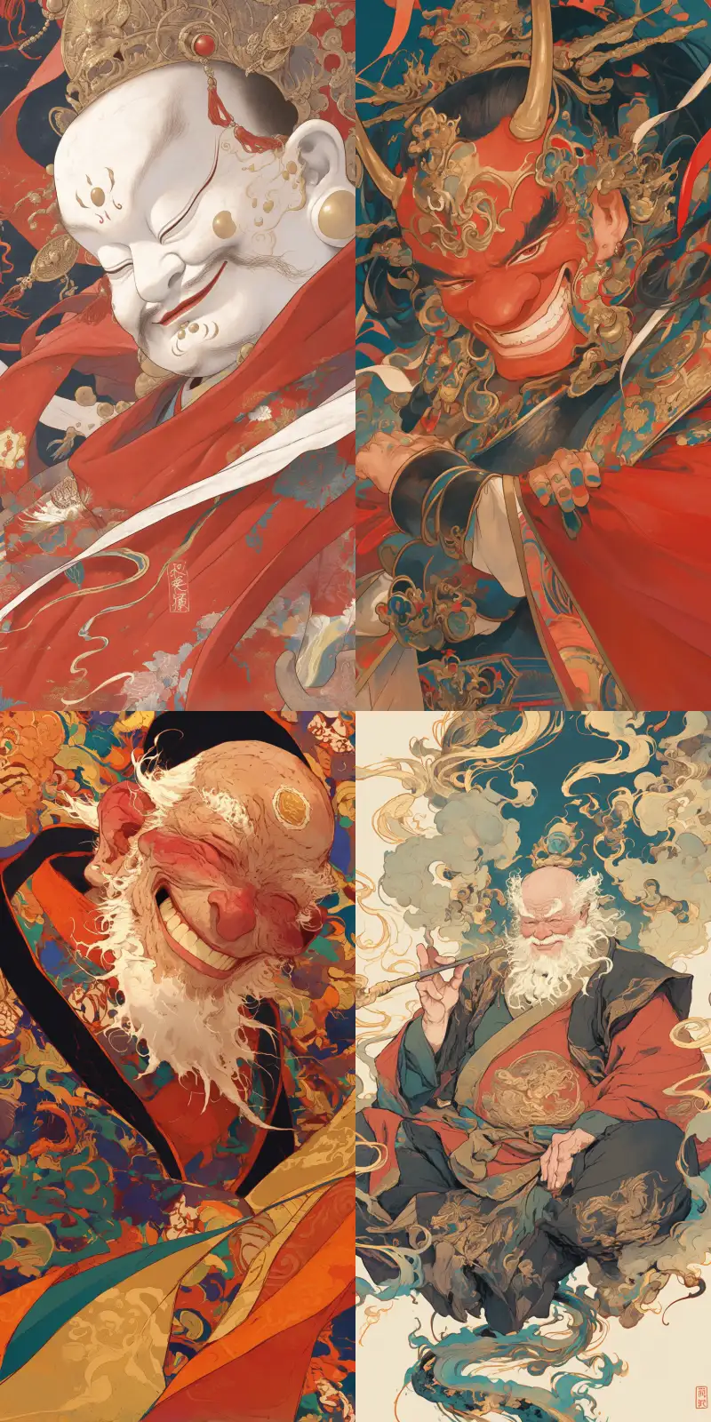 Midjourney Bot 更新时间:2024-11-09 00:21God of Wealth, smile, Dunhuang cave murals, red robe, handsome, print, bright colors, strong sense of lines, lively and vivid, close-up shot, finely detailed, ukiyo-e --niji 6 --ar 1:2 --s 250