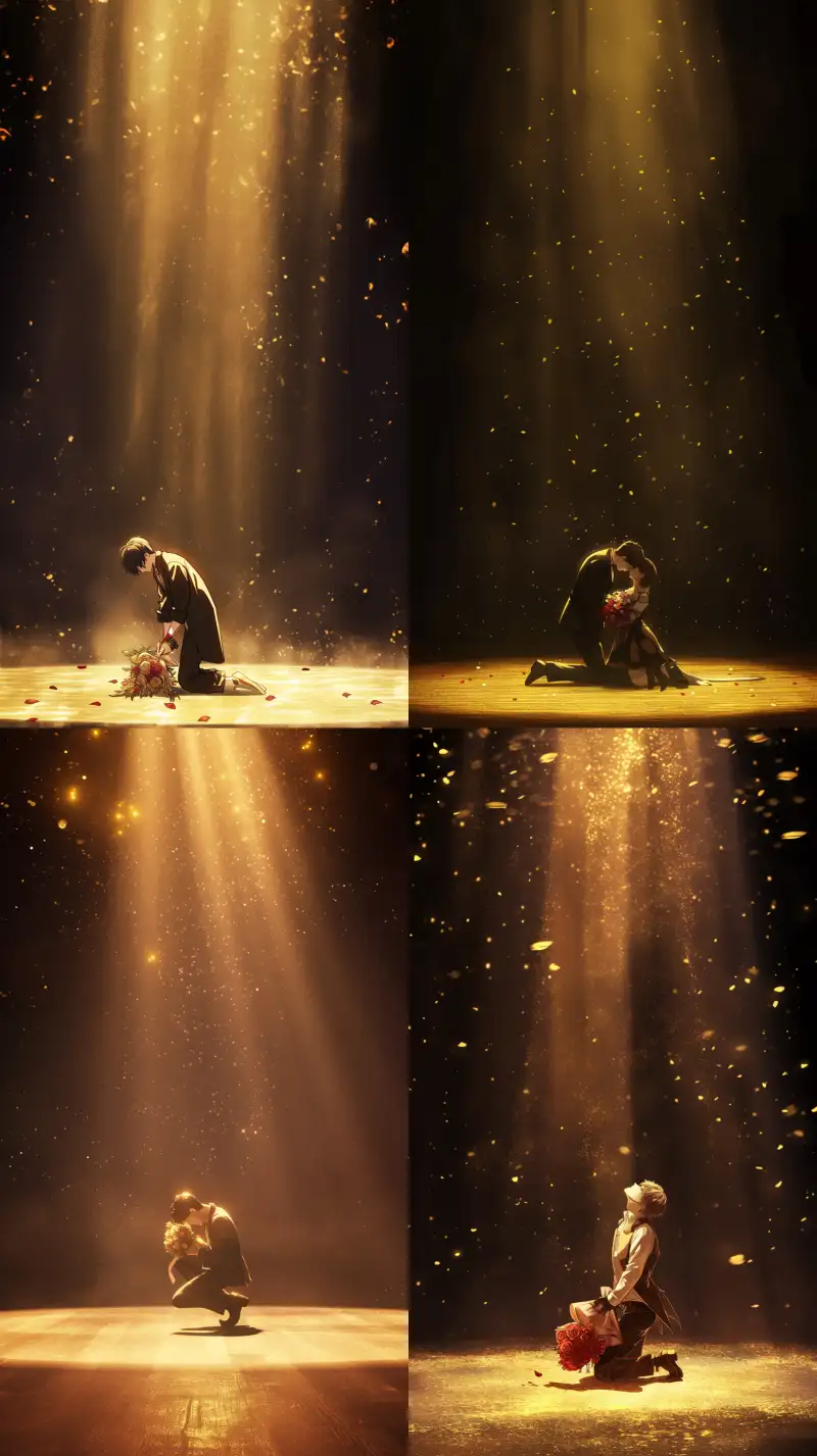 Midjourney Bot 更新时间:2024-11-10 00:04Against a dark background, the spotlight was shining on the ground, with golden light shining from above. Under the spotlight, a young man half kneeled to propose, holding a bouquet of roses. Dust was floating in the air, and the empty stage was as realistic as a photograph --niji 6 --ar 9:16 --style raw --s 162