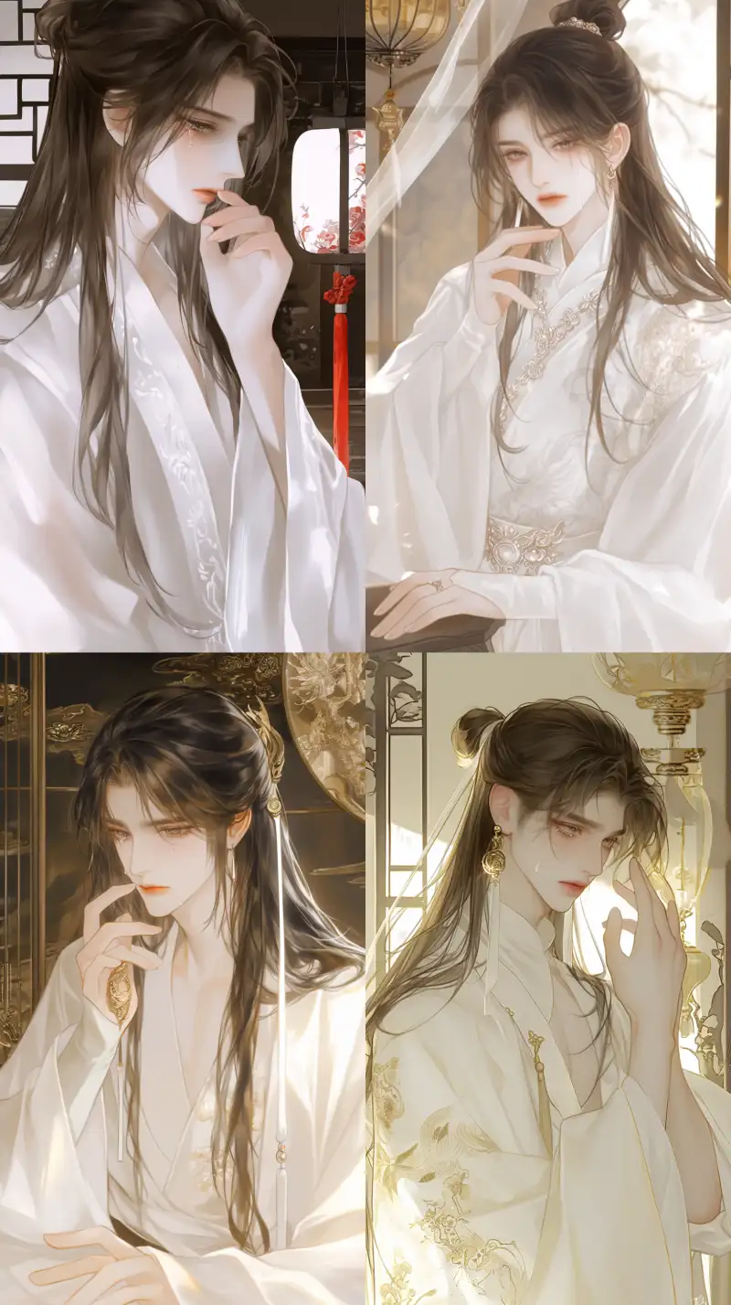 Midjourney Bot 更新时间:2024-11-04 00:00A handsome man with a half-up bun, crying, upper body, wearing a luxurious white Han Dynasty long dress, in a room with a Chinese ancient style background. --niji 6 --ar 9:16 --style raw --s 50 --p jyrxfth
