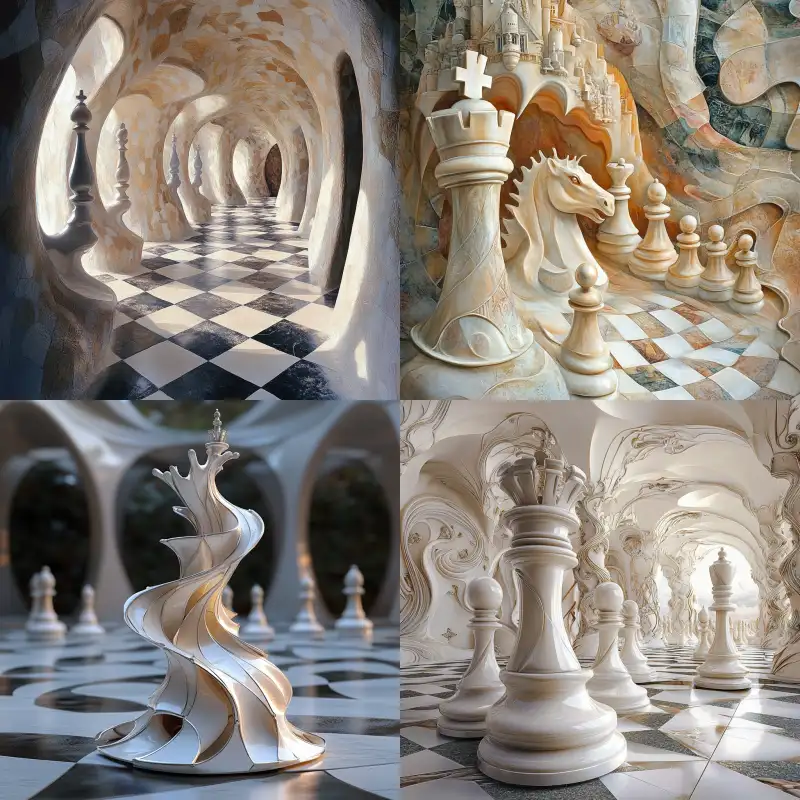 Midjourney Bot 更新时间:2024-11-04 00:02Light colored, Gaudi, flowing and elegant, chess --v 6.1 --ar 1:1