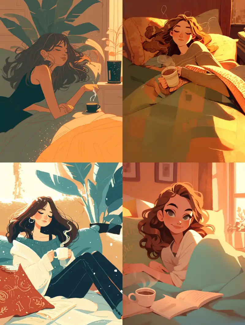 Midjourney Bot 更新时间:2024-11-03 00:04Cartoon illustration style, a young woman comfortably lying on a comfortable bed. The room is filled with a warm and enticing atmosphere, with soft lighting casting gentle shadows. The bed is decorated with plush pillows and soft blankets, adding a relaxing feeling. Her expression was calm and satisfied, with a steaming cup of tea and a book placed on a small bedside table nearby. The environment aims to evoke a sense of tranquility and comfort, inspired by the warm style of Studio Ghibli. This scene captures a moment of quietness, rest, and tranquility --niji 6 --ar 3:4
