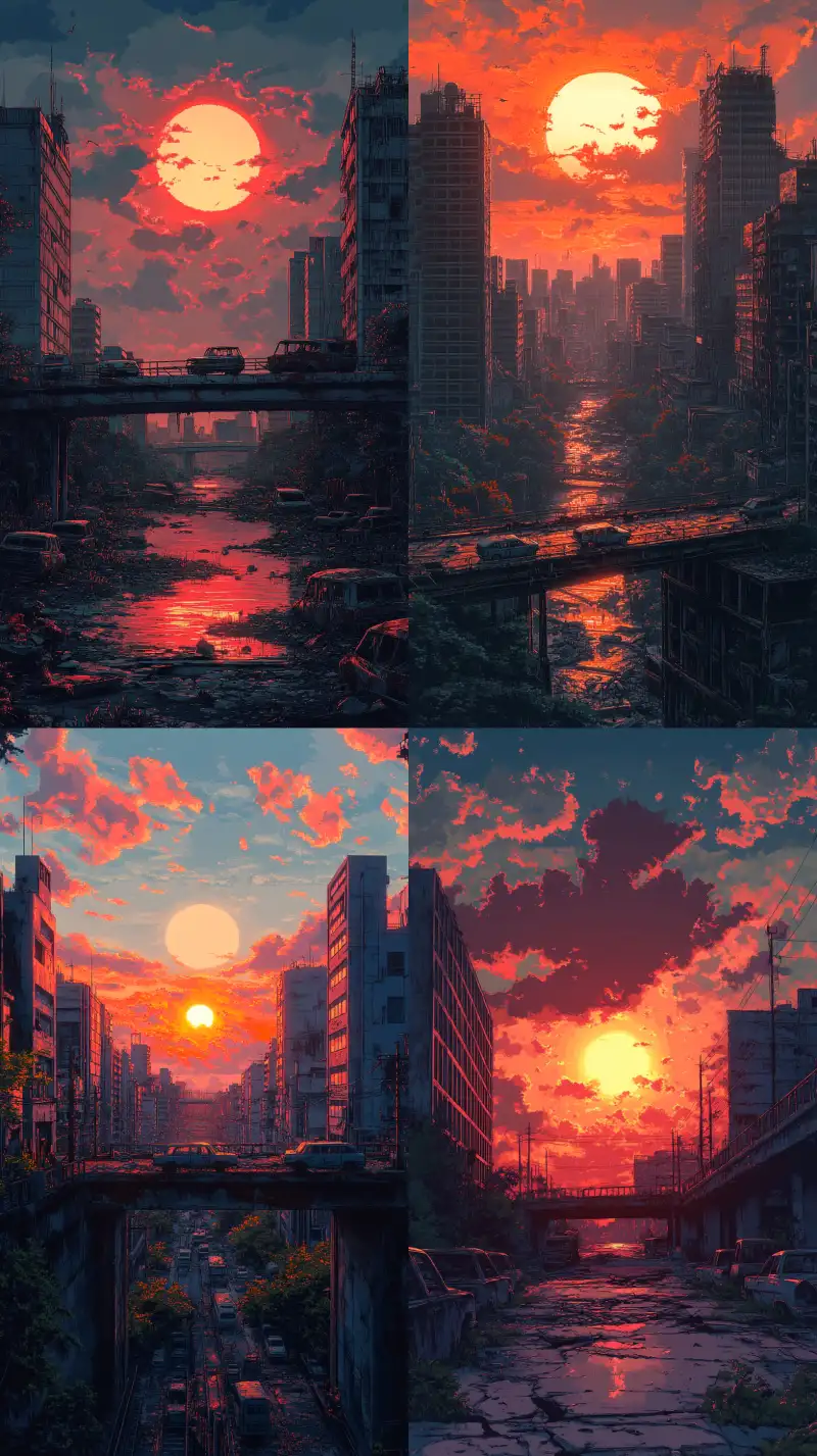 Midjourney Bot 更新时间:2024-11-03 00:06A broken overpass, with abandoned vehicles on it, next to dilapidated urban buildings. The glass curtain walls reflect the setting sun and clouds, while in the distance, a magnificent sunset highlights an apocalyptic atmosphere, merging the aesthetics of the 1950s with futuristic elements, using soft, desaturated colors of grayish-white and rust to convey a sense of gloom and decay. Pixel art::19 , --v 6.1 --ar 9:16 --s 383 --c 4