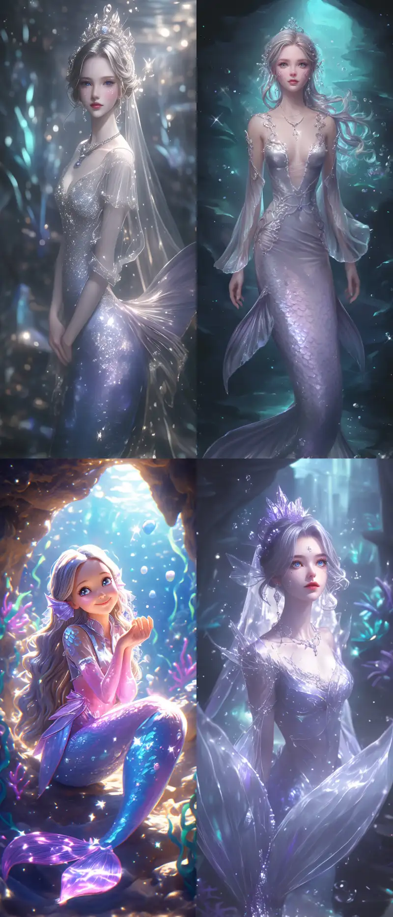 Midjourney Bot 更新时间:2024-11-03 00:06A mermaid, her skin is pearl white, her hair is silver gray, her eyes are crystal blue, her cheeks are adorned with diamonds, she wears a light purple veil, crystal clear, her sleeves flow like a flowing sea, inlaid with crystals and pearls, in the shimmer of the ocean, a dream twinkles. Her fish tail is slender and graceful, emitting a charming lilac purple fluorescence. Her scales are arranged neatly and meticulously crafted, with a string of sparkling bubbles. Her face is exquisite, her facial features are as perfect as carving, her eyebrows and eyes are distant, her eyes are like stars, her lips are like delicate coral, and her mouth is slightly raised, with a mysterious and charming smile. Describe in detail the characteristics of a mermaid, especially her sparkling purple tail. In the background, an underwater cave filled with fluorescent plants enhances the dreamlike effect. The atmosphere is full of mystery and fantasy, 3D modeling, clear faces, illustration style, digital art, using rich colors and fine brushstrokes, 8K high-definition resolution, - s 1000 --niji 6 --ar 329:768 --no Watermark, --s 1000 --c 5 --weird 5