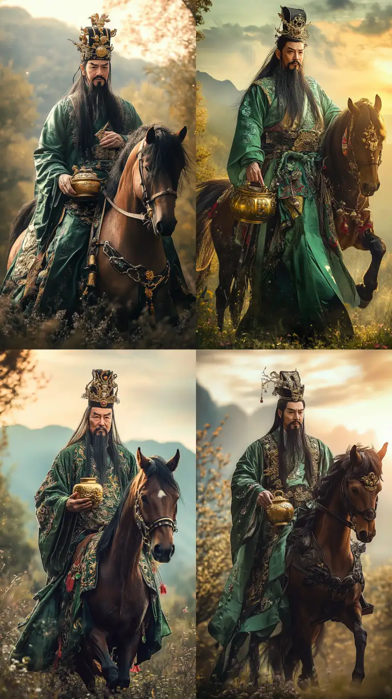 Midjourney Bot 更新时间:2024-11-02 00:04A Chinese immortal grandfather, dressed in a gorgeous green Chinese Hanfu, has an outstanding appearance, exquisite facial proportions, a golden black crown and hat on his head, a long black beard, black hair, a tall figure, beautiful and solemn divine majesty. He holds a golden treasure pot in his hand and rides a gorgeous brown warhorse. The horse's front hooves jump up, and there are small grass and flowers on the ground, a fairyland. There are mountains in the distance behind him, and the sunlight shines brightly, with rainbows and lush trees. The high-definition picture is 8K, and the photography is realistic --v 6.1 --ar 9:16 --style raw