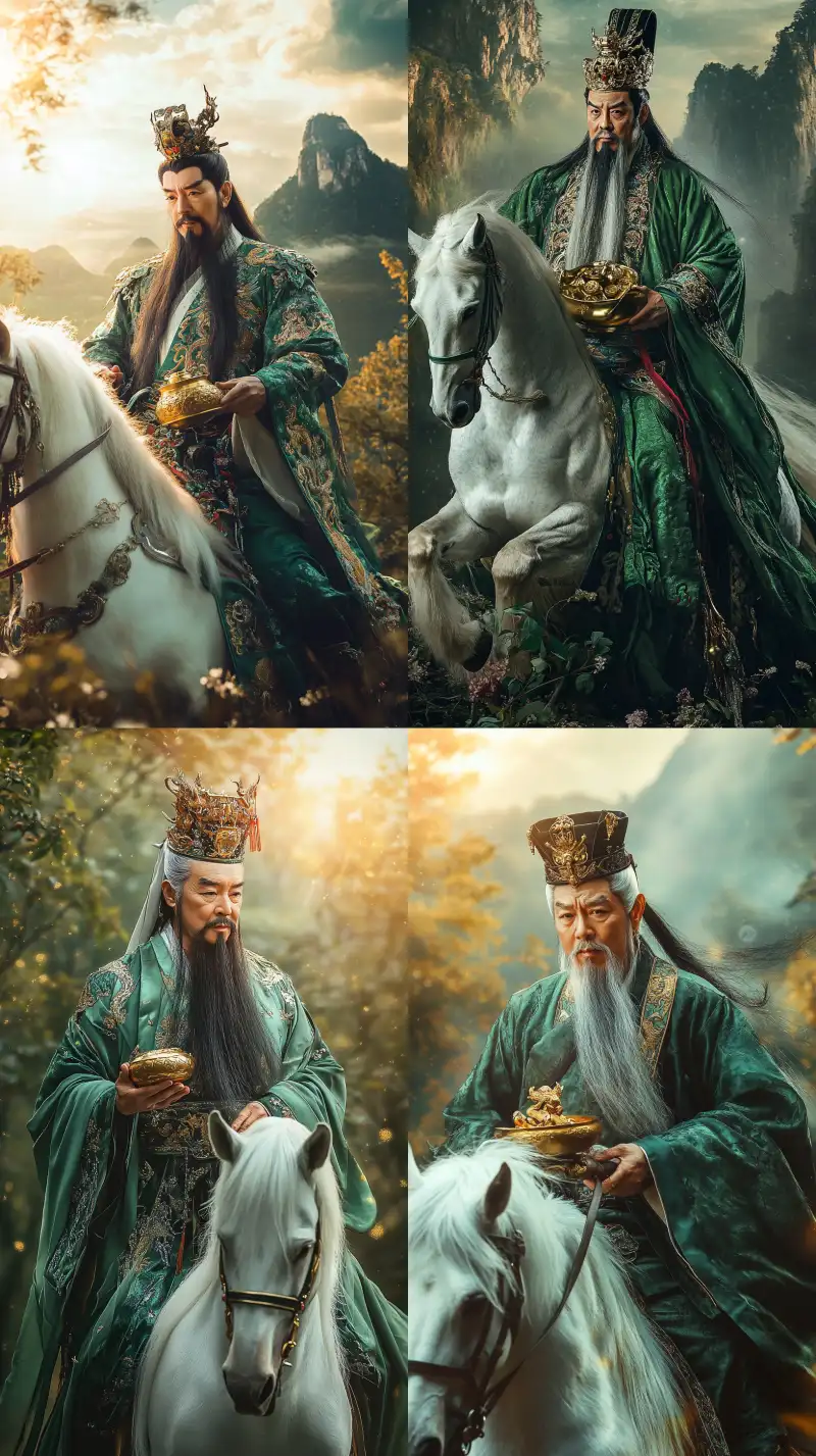 Midjourney Bot 更新时间:2024-11-02 00:04An old Chinese immortal grandpa, wearing a luxurious green Chinese Hanfu, with an outstanding appearance and exquisite facial proportions, wearing a golden and black crown hat on his head, black long beard, black hair, tall stature, beautiful and solemnly sacred and majestic. He is holding a golden treasure bowl in his hand, riding a magnificent white war horse, the horse's front hooves are jumping up, there are small grasses and flowers on the ground, a fairyland, with distant mountain peaks behind him, bright sunlight shining down, a rainbow, lush trees, high-definition image 8K, photographic photo realism. --v 6.1 --ar 9:16 --style raw
