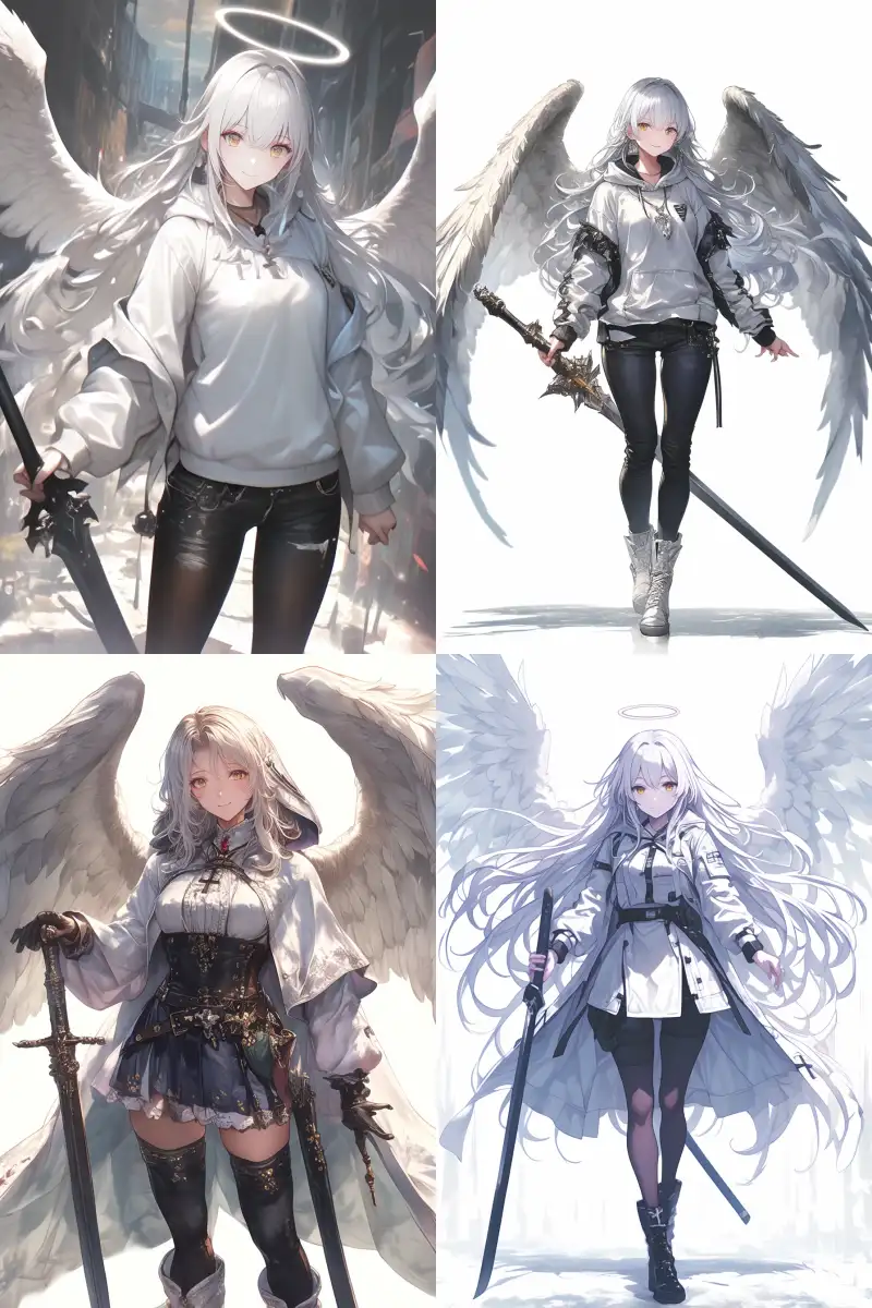 Midjourney Bot 更新时间:2024-11-02 00:09A beautiful woman with long white hair, wearing a white hooded sweatshirt, bangs, golden eyes, black jeans, white long boots, and white angel six-winged wings. She is holding a black long sword in her hand, has a dark red angel halo above her head, is smiling, has a mature charm, straight white hair that is soft and smooth, with a pure white background and pure white color tone, 8k, full-body close-up, long legs, and a slim waist. full body character design,white hair,Hoodie, --niji 6 --ar 2:3 --s 1000