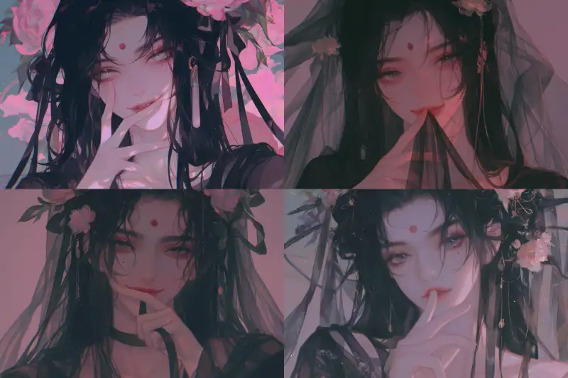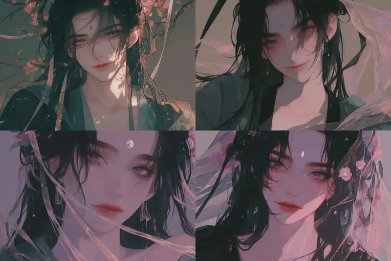 Midjourney Bot 更新时间:2024-10-28 00:00Male, single, (black long hair), lightweight azure Hanfu, sheer fabric, long eyelashes, clear, ancient style, looking at the camera, facial close-up, highest quality, stunning eyes, long lashes, clear, eye close-up, delicate rendering, collarbone, exquisite features, rich details, deep affectionate eyes, beautiful mole, extremely fine hair strands, long eyelashes, clear, realistic, artistic conception, beautiful man, scheming, exquisite, beautiful, charming smile, beautiful, gorgeous black sheer clothing, ribbons, silk and satin, pitiful yet delicate, a pretty and vibrant Hanfu, pure and innocent, with a pitiful expression on the face, beautiful and luxurious hair accessories, gorgeous lines, alluring smile, flamboyant, smile, bright red makeup, stunning, beautiful smile, beautiful, beautiful, exquisite person, gentle and charming raised brow smile, enchanting, half-length portrait, matte quality, forehead peony flower emblem, flower dot, hazy beauty, matte, cool color filter, dreamy matte quality, clear quality, ancient style background, fingertips placed near the mouth. --sref