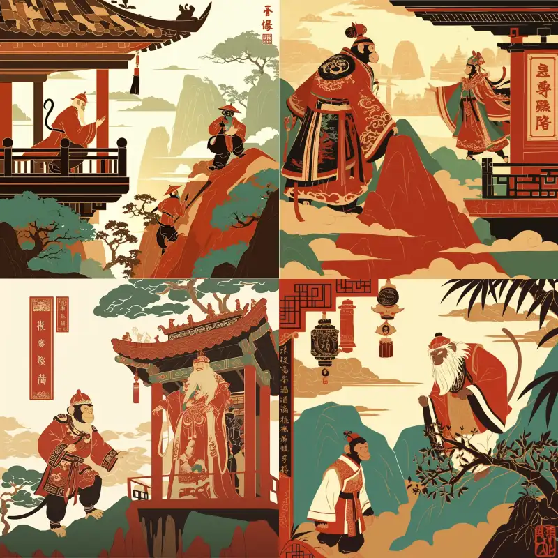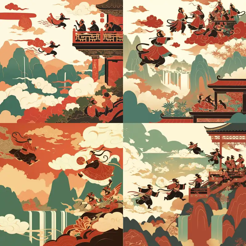 Midjourney Bot 更新时间:2024-10-28 00:01Chinese shadow puppetry, monkeys stomping on auspicious clouds, flying towards a mountain range with waterfalls --sref