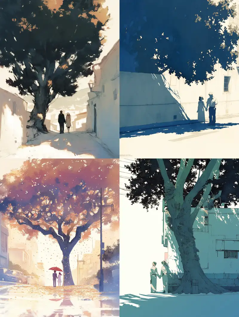 Midjourney Bot 更新时间:2024-10-18 00:13Street, big tree, cool tones, white space, couple holding hands under the tree --niji 6 --ar 3:4