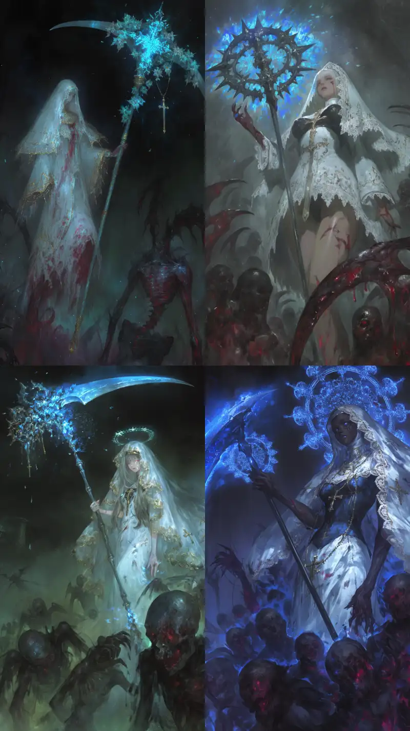 Midjourney Bot 更新时间:2024-10-17 00:14In the lightless realm of the abyss of hell, a stunningly beautiful saint stands proudly, as if she is a pure ray of light that has mistakenly fallen from the heavens. In her hand, she tightly grasps a scythe emitting a faint blue glow; this weapon seems forged from shards of stars, and each swing shatters the darkness, stirring a chilling wind of death that causes the surrounding ravaging demons to tremble. Her magnificent attire was supposed to be a pristine white veil, delicately and intricately outlined with lace to depict divine nobility; however, under the flames of hell and the baptism of battle, this gown has become tattered and worn, the golden embroidery faded and mottled, resembling a post-war tapestry from ancient legends. Nevertheless, this disarray not only fails to diminish her grace but instead adds a touch of tragic beauty, like a phoenix reborn from the flames of war, carrying an undeniable strength and resilience. The surface of the saint’s skin is marked by the scars of battle, mingled with bright red and ashes, dripping together with her crystal tears, blooming like flowers in this barren land. Though her face appears weary, it remains striking and ethereal; her eyes resemble the brightest stars in the deep night sky, sparkling with untainted determination and hope even in this place of despair. She glides through the throngs of demons with an elegant yet deadly demeanor, every swing of her scythe precise and true, as if dancing a deathly ballet—both cruel and exquisite. Her very existence is a contradictory hymn, a symphony of light and darkness, beauty and destruction. The demons around her appear small and cowardly in the presence of this saint; they fear the sacred power emanating from her very soul, a power that makes them realize that even in this chaotic hell, justice and sanctity can still find a foothold. Each step she takes treads upon the horror of the demons; she is not only a warrior in this endless war but also a guide leading lost souls back to the light. In this desperate abyss, the gorgeous saint, clad in a tattered luxurious gown and bearing countless wounds, continues her lonely yet magnificent journey, her silhouette becoming the most incredible miracle in hell—a timeless symbol of resistance against evil and a guardian of hope. --niji 6 --ar 9:16 --no Woman --s 1000 --p 4ocqolt