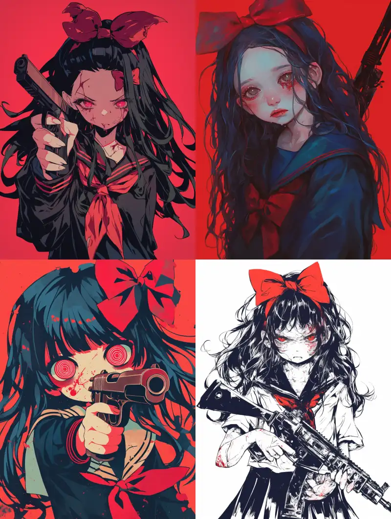 Midjourney Bot 更新时间:2024-10-17 00:14A cute little girl, with black long hair, wearing a sailor suit, with a red bow on her head, highly saturated colors, scary, terrifying, holding a toy gun. One line art, --niji 6 --ar 3:4