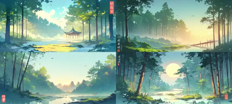 Midjourney Bot 更新时间:2024-10-14 00:07The afterglow of the setting sun shines into the depths of the dense forest, reflecting on a patch of moss. Ultra-high definition resolution, Chinese landscape painting style. --sref