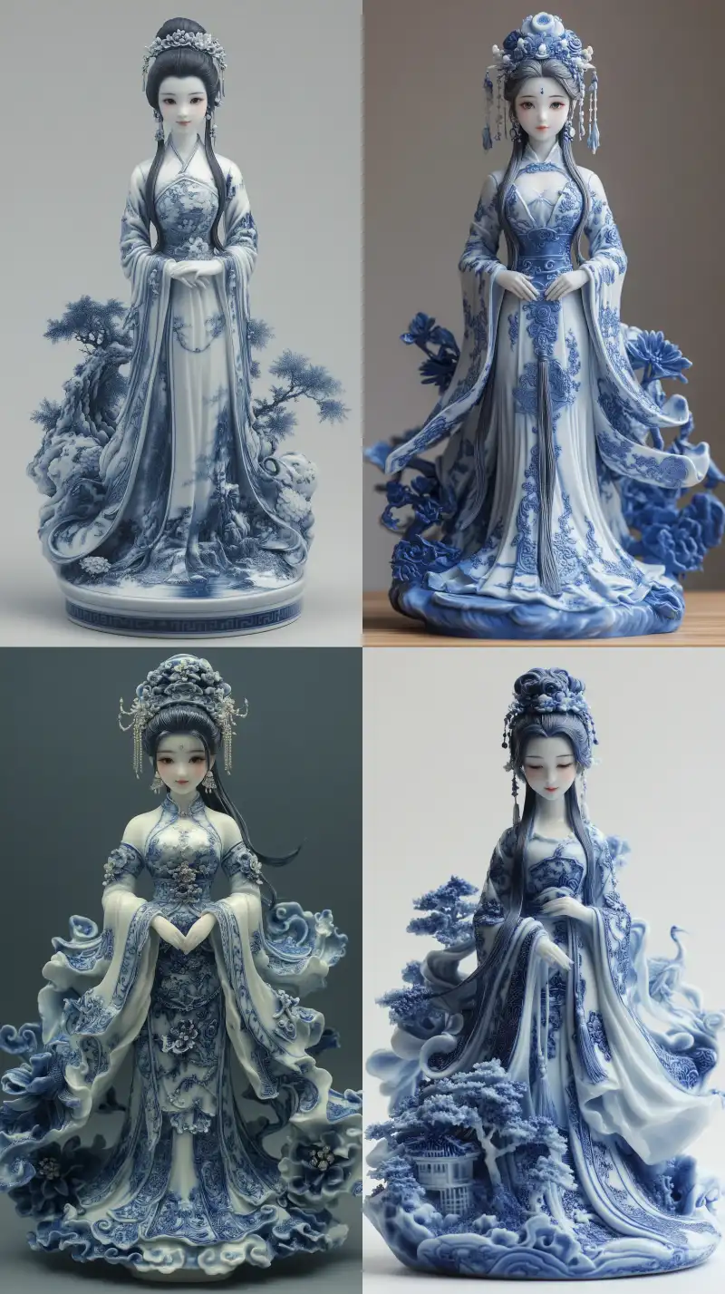 Midjourney Bot 更新时间:2024-10-14 00:13A Chinese blue and white porcelain ornament, the ornament features a beautiful young Chinese woman with long hair, dressed in an ancient Chinese long dress, full-body perspective, exquisite face, her lips full, smiling, ultra-clear details, delicate skin texture, high resolution, Porcelain, --v 6.1 --ar 9:16 --style raw --s 472 --c 15