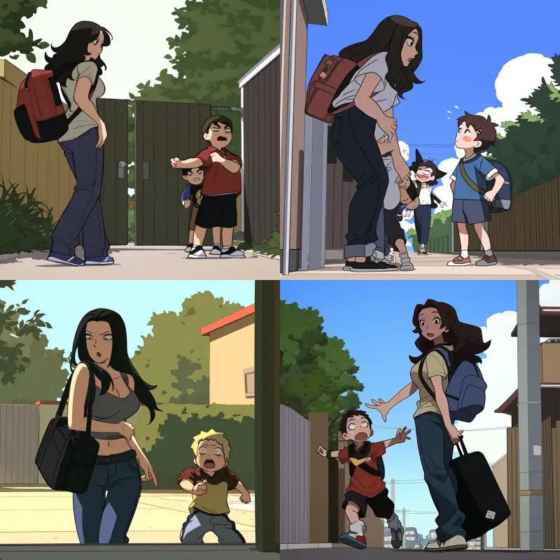 Midjourney Bot 更新时间:2024-10-14 00:141. 1.1 A 30-year-old woman with black long hair, gray T-shirt, blue jeans, surprised expression, seeing beautiful parents, son: a 7-year-old boy with yellow short hair, blue school uniform, anxious expression, blocking in front of his mother, at the school gate, parents coming and going, frontal, full body, mid-range 3D Comics --sref