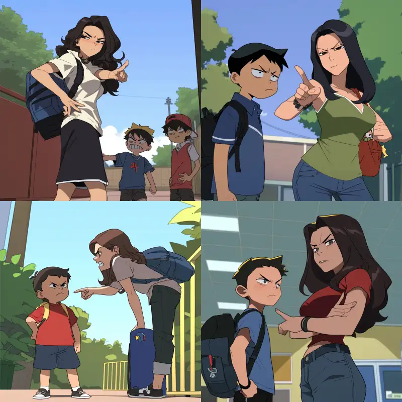 Midjourney Bot 更新时间:2024-10-14 00:142. 2.1 A 30-year-old woman with black long hair, gray T-shirt, blue jeans, awkward expression, criticized by her son, son: 1. A 7-year-old boy with yellow short hair, blue school uniform, angry expression, pointing to his mother, at the school entrance, classmates watching, frontal, full body, 3D Comics in the middle picture --sref