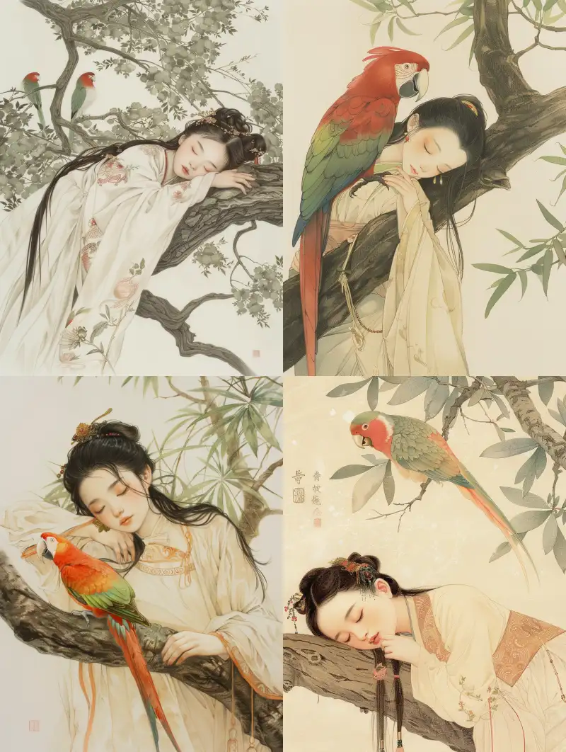Midjourney Bot 更新时间:2024-10-09 00:07A young girl from ancient China, with long black hair styled in a bun, wearing a cream-colored Hanfu, lying on a tree branch asleep, beside her is a red and green parrot, facial details, delicate features, elegant and natural contour lines, variations in the thickness of the contours. This painting uses a colored pencil line style, employing light colors on a white background, with a cream-colored color scheme, and flat coloring. --v 6.0 --ar 3:4 --s 101