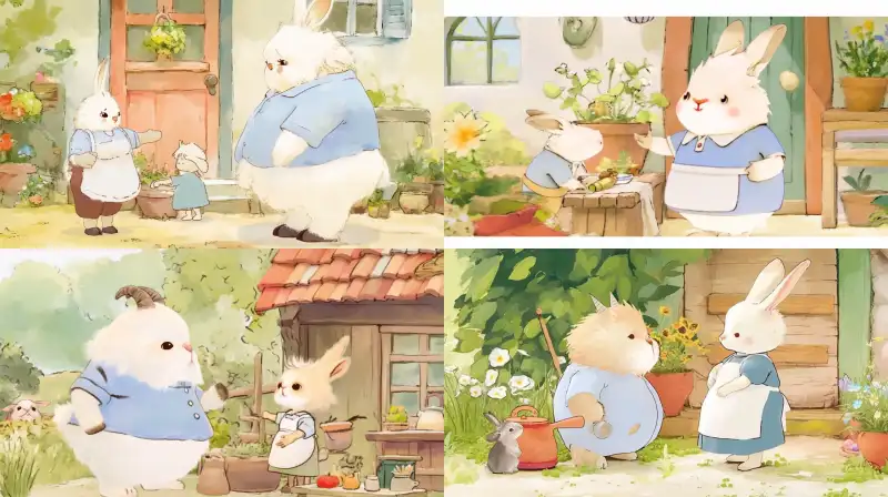 Midjourney Bot 更新时间:2024-10-09 00:09On the farm lives a proud little white rabbit, wearing a blue short-sleeve shirt. The neighboring Uncle Goat is talking to Rabbit Mom, who is working around the farm in an apron. 3D animation style, suitable for children to watch. --sref