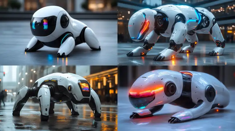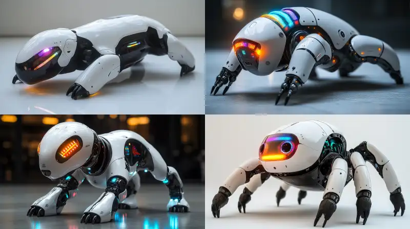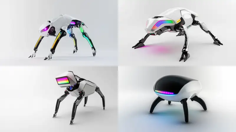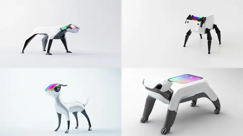 Midjourney Bot 更新时间:2024-10-05 00:03Design an intelligent robot dog with a white background, a cube like body, stick shaped limbs that can rotate 360 degrees for support, a silver body, and colored light strips below the surface. The overall design is simple yet futuristic, with four legs and black feet. Exquisite appearance, giving people a high-tech feeling. It has rainbow lights inside its head that light up as if displaying data or other information. This design creates a sense of modernity while also maintaining simplicity. White background. High resolution. Complete Details --v 6.1 --ar 16:9 --s 21 --c 3