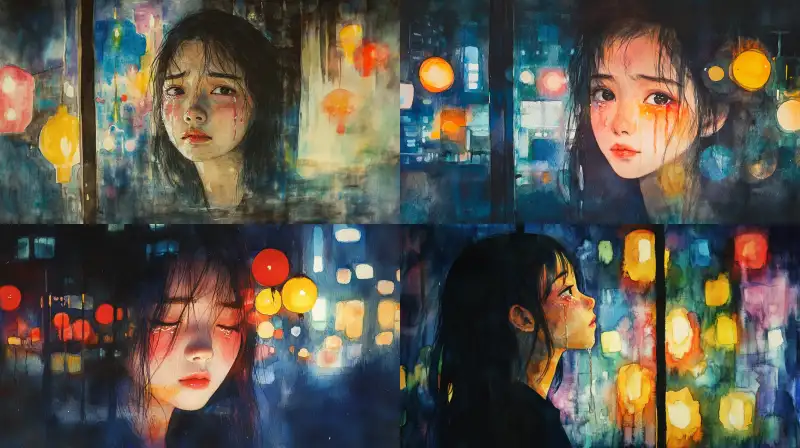 Midjourney Bot 更新时间:2024-10-05 00:01Watercolor painting, Chinese person, the colorful streetlights outside the window at night illuminate the beautiful middle school girl's tear-streaked face, various online celebrity phrases echoing around, in a surreal dream. --v 6.1 --ar 16:9