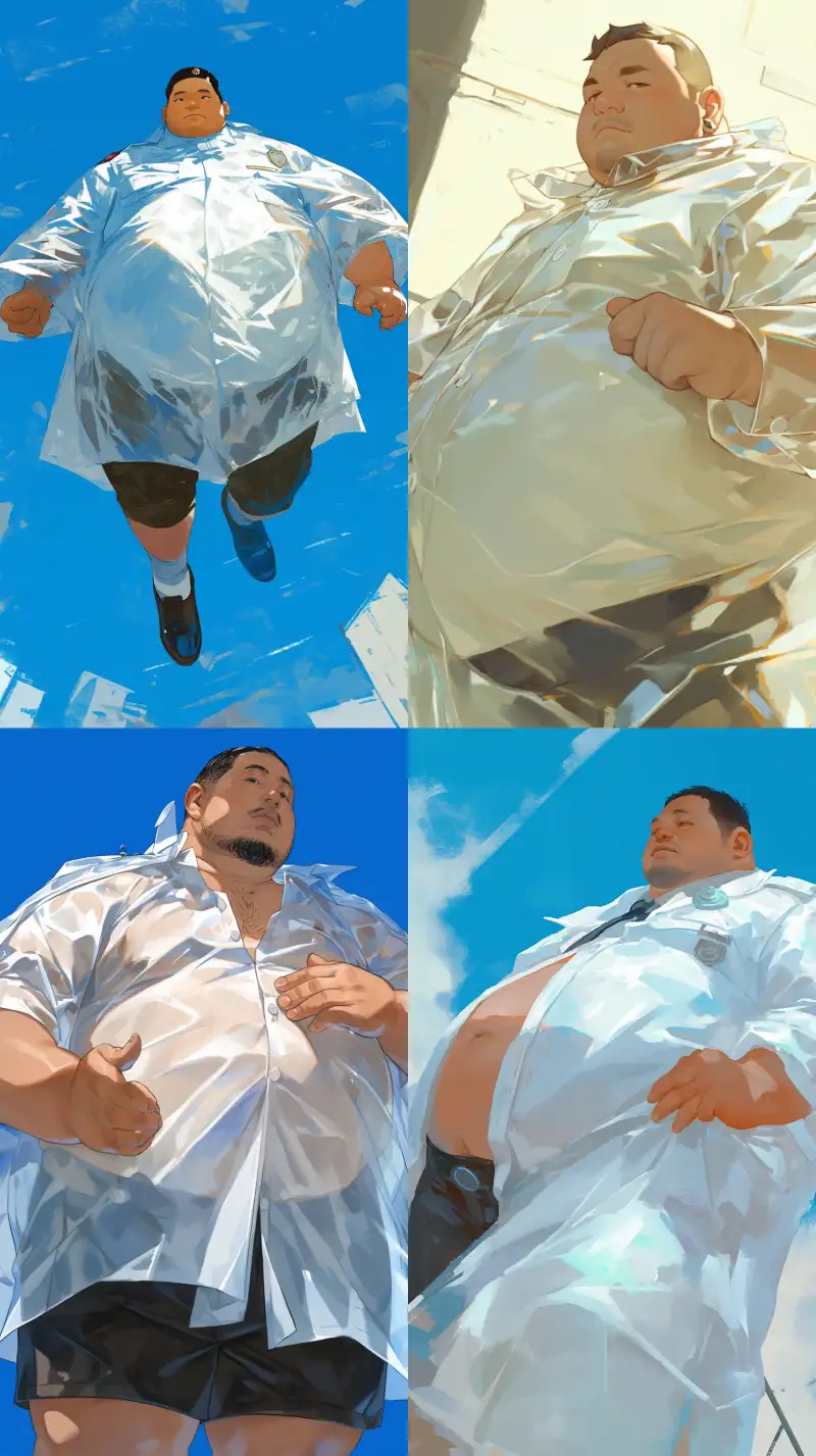Midjourney Bot 更新时间:2024-10-05 00:05An Asian middle-aged man, a police officer, round face with double chin, thick neck, huge and stout neck, sturdy build, overweight, plump and rounded figure, enormous chest muscles, thick calves, exposing belly, wearing a loose transparent white raincoat, camera angle looking up from the ground, greatly upward view, two-dimensional, minimalist style, flat painting style. --niji 6 --ar 9:16