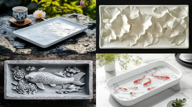 Midjourney Bot 更新时间:2024-10-04 00:232: 1 rectangular tea tray, white stone pattern, five gourd relief patterns, lucky and longevity relief patterns, koi fish relief patterns, --v 6.1 --ar 16:9 --c 25