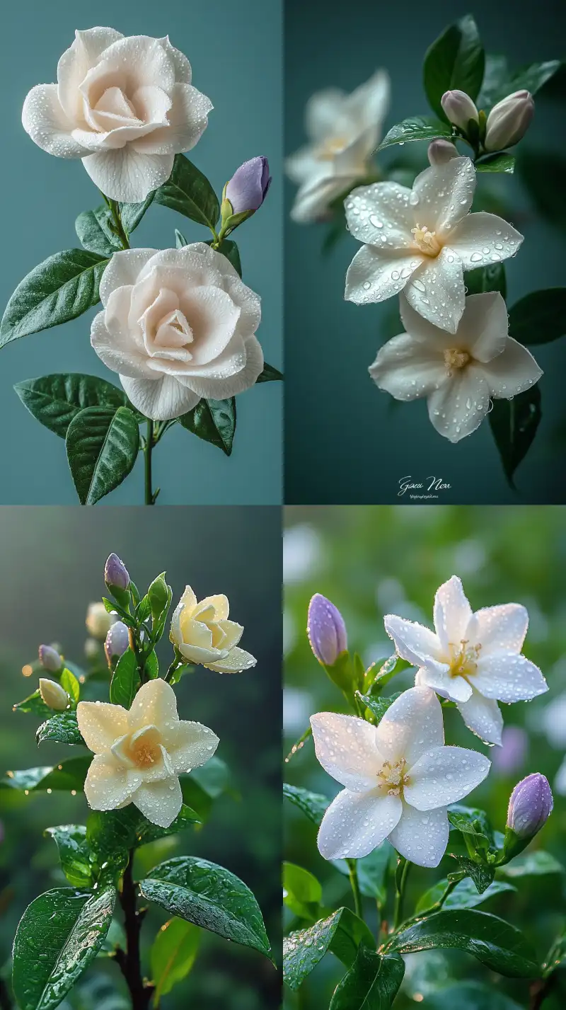 Midjourney Bot 更新时间:2024-10-04 00:25White gardenia flowers, purple flower buds on branches, green leaves, dew drops hanging on petals, high-definition photography, high resolution, high detail, solid color background, natural lighting, soft colors, high quality, high clarity, professional photography with high detail. --v 6.1 --ar 9:16 --style raw --s 469 --c 14