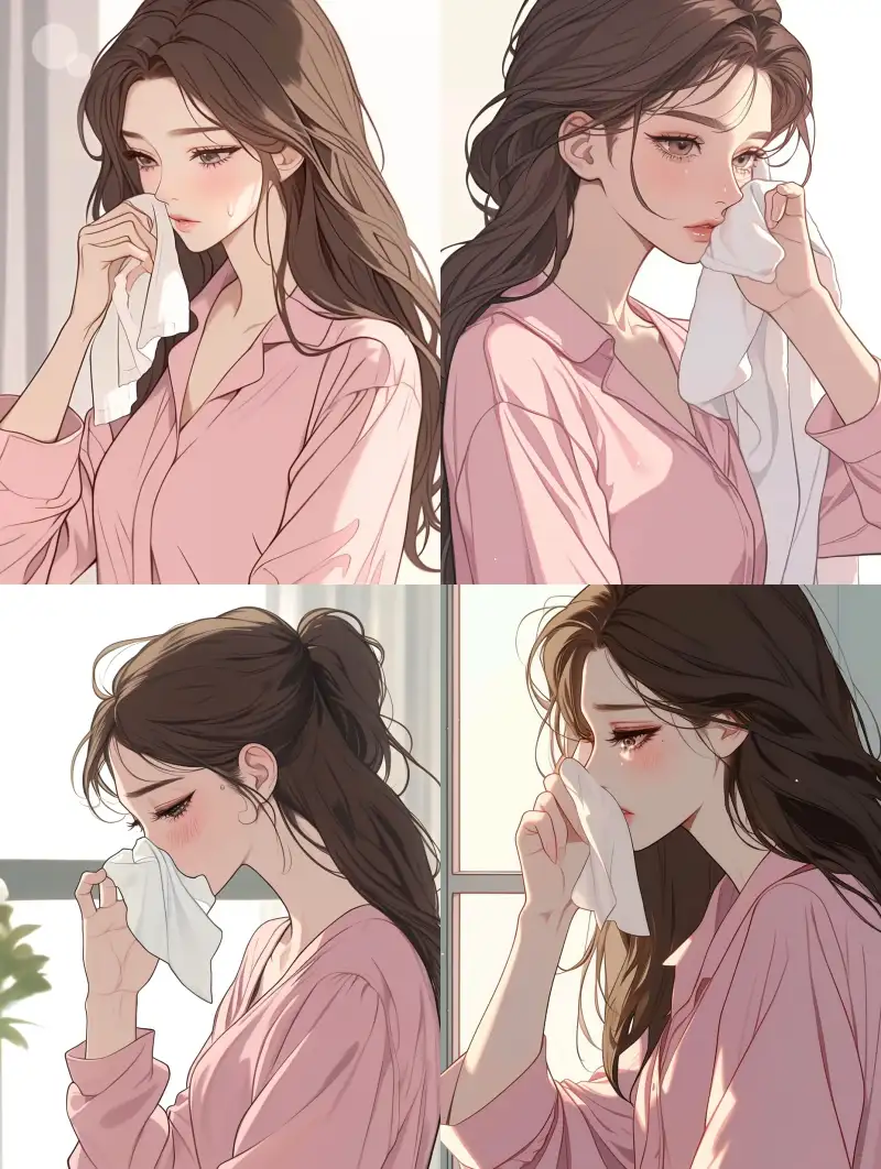 Midjourney Bot 更新时间:2024-10-04 00:27A girl wearing pink long sleeved pajamas, wiping her face with a tissue, medium shot, thick lines, pure hand drawn, comic style --sref